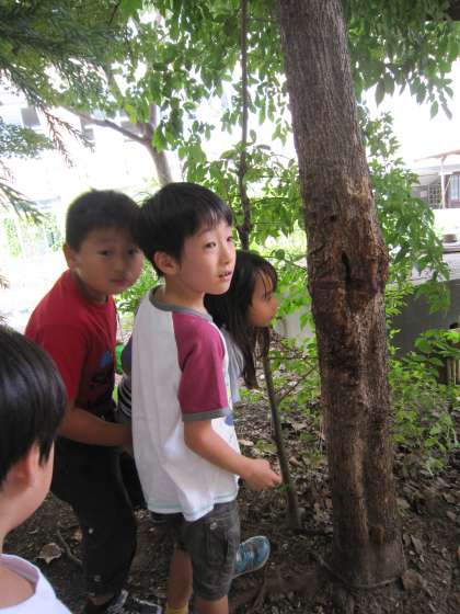 昼休みの中庭,1年生が木の所で何かを見ているようです。近寄って聞いてみると,木の幹にクワガタみたいなのがいるとのことでした。