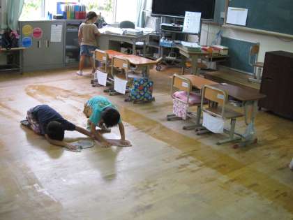 床や廊下をきれいにしようと,雑巾がけをしている子ども達がいました。