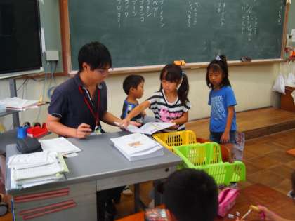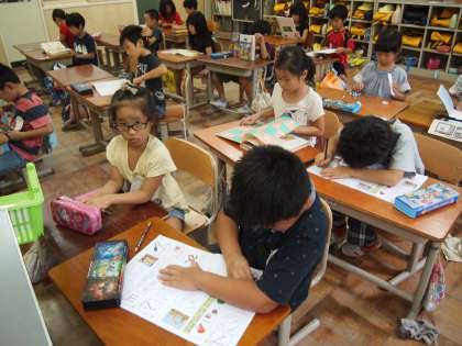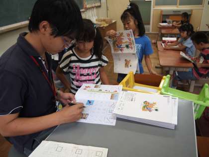 1年2組はカタカナの練習タイムです。黒板には「ブーメラン」「ベルマーク」「フナッシー」など,たくさんのカタカナが書かれていました。