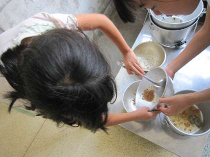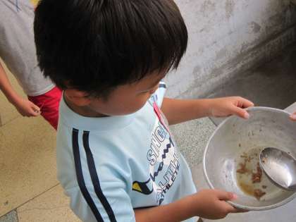 給食時間が終わって,サービスホールで待っていると,子ども達が食器などを返しに来ます。