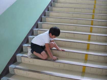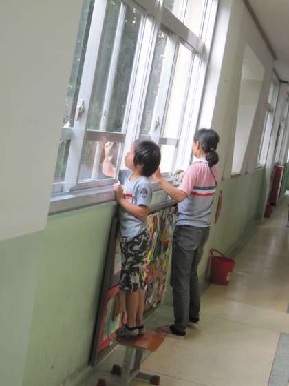 窓や階段をきれいにしようと,ふいてくれている子ども達がいました。