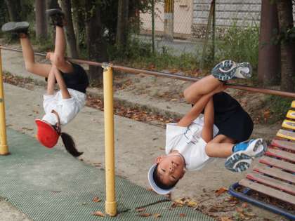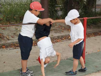 1年2組の鉄棒です。「ちきゅうまわり」が上手にできた人がいるので,みんなの前 で見せてくれました。