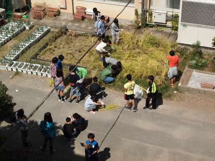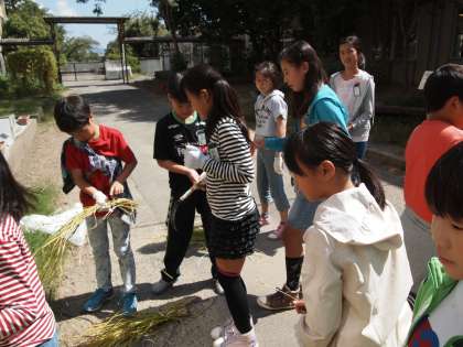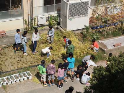 今度は5年2組の稲刈りです。張り切って収穫していました。