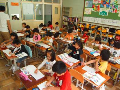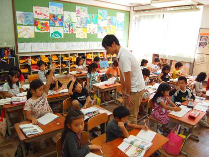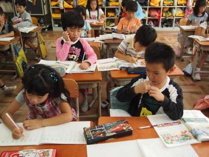1年2組です。こちらも算数。「10−4−2=]などという3つの数が出てくる計算にチャレンジしました。