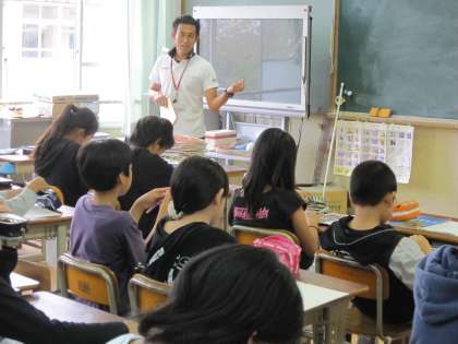 6年1組では,昨日,河村能舞台で行われた「能」についての講座に,参加した話を子ども達にしていました。国語の学習で行った「狂言」との違いや「能」の衣装を着たことなどを話していました。