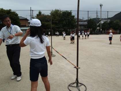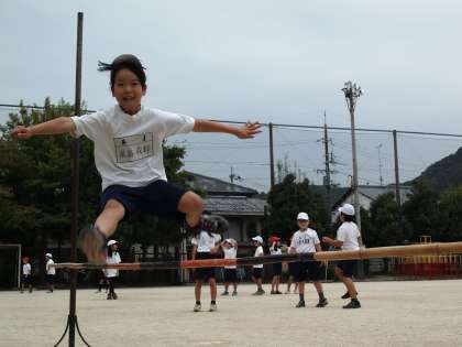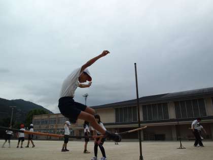 4年1組は「たかとび」です。何度かやってきてずいぶん記録が伸びた子もいるようです。「あと少しの工夫でとべるのになぁ…」ともったいない気がする子もいますね。工夫するところを意識して再チャレンジしてほしいです。