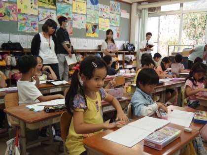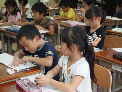 今日は「3つの かずの けいさん」です。3枚の挿絵を順番に見ながら,数の増減に注意してお話を作るというものです。数図ブロックを使って一生懸命問題を解こうとする子どもらの姿が見られました。