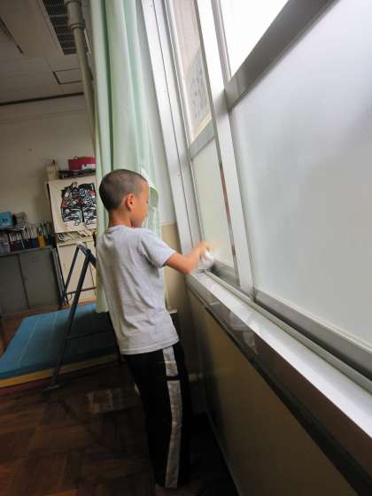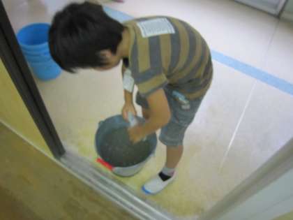 使った雑巾は,バケツに入れた水で洗って使うように指導しています。
