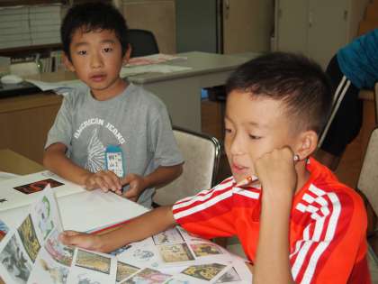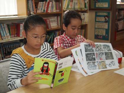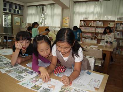 お話の絵に取り掛かっている4年2組です。魔女やドラゴンの絵を描くのはなかなか難しいので,参考になる本を図書館に探しに行きました。いいのがあったかな?