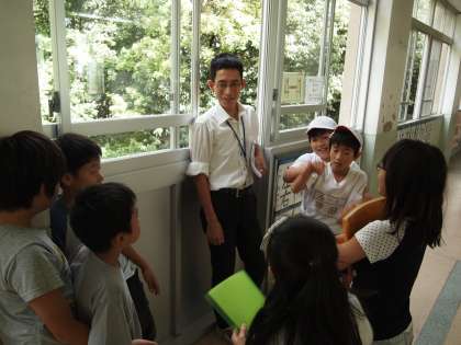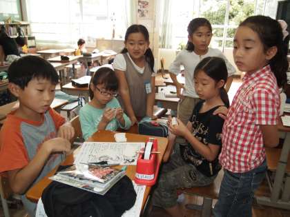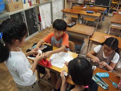 中間休みに楽しそうな光景を見ました。ろうかでは子どもらと先生が楽しそうにおしゃべりをしています。教室では子どもらに「何してるの?」と尋ねたら「牛乳パックを作ってんねん」と答えてくれました。