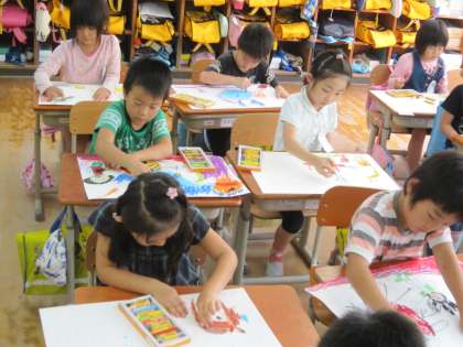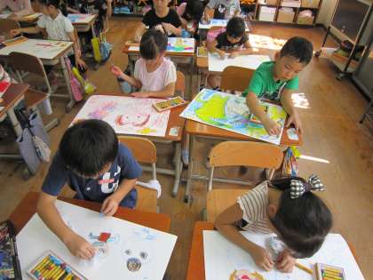1年1組では,したがきを終え,クレパスで色をぬっていました。
