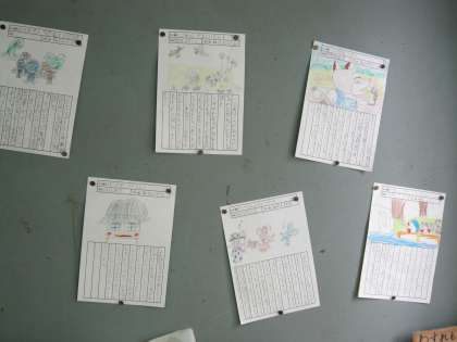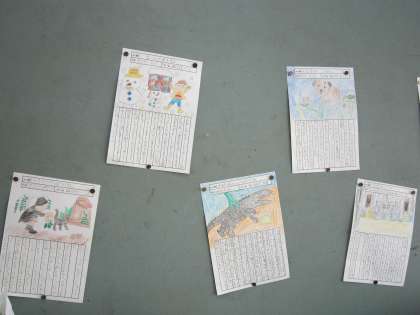 3年1組の教室には,子ども達のかいた読書絵葉書が掲示されていました。