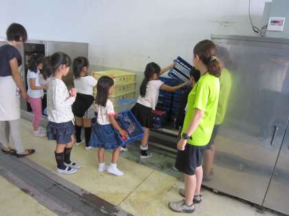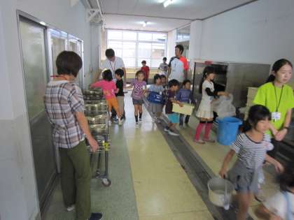 今日も給食後,給食室のサービスホールで待っていると,食缶を空にした子ども達がやってきました。