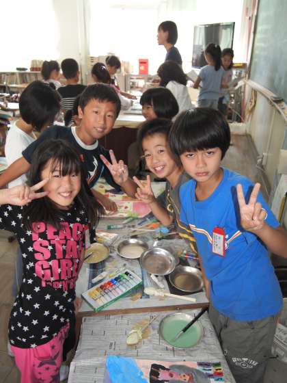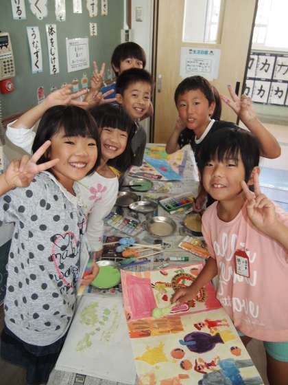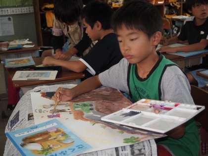 3年1組のお話の絵もずいぶん出来上がってきたようです。今日は配膳台の所でみんなで盛り上がっていました。