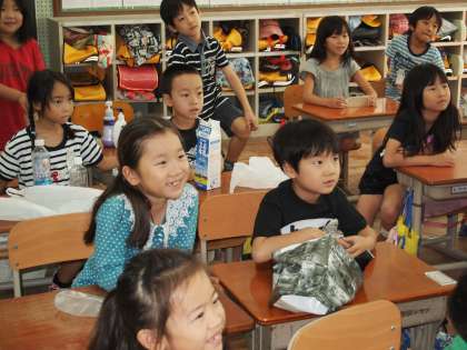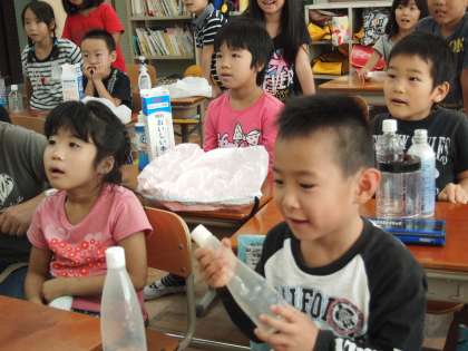 子どもたちの表情が輝いています。1年2組です。「大きさ(かさ)くらべ」をしているところです。家からプラスチックや紙の入れ物を持ってきました。そこに水を入れてあふれ方を見て「どちらが大きい」というのを比べているようです。