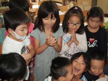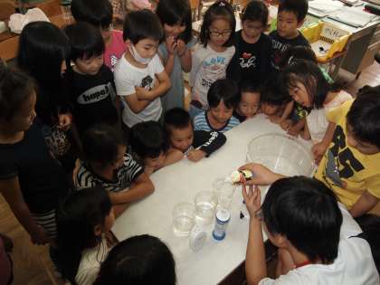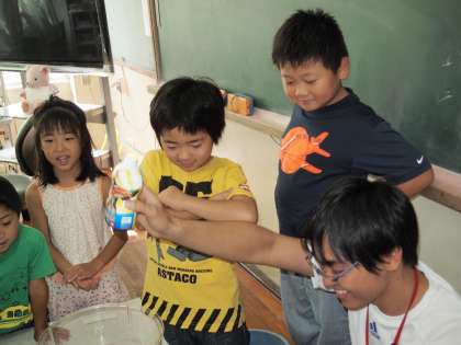1年2組の「大きさ(かさ)くらべ」がまだ続いていました。何やら持ち寄ったものの中でいろいろ試しているようですね。それにしてもみんな楽しそうです。