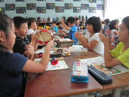 2年1組では,トライアングルやタンバリンなどを使って虫の声を作っていました。