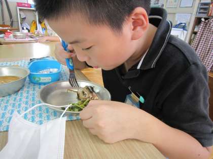 「骨まで食べられるよ。」と言うと,「わかりました。」と答えてくれ,さんまをほおばっていました。
