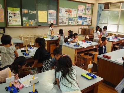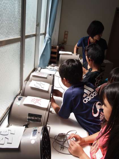 3年1組は理科室で「風のはたらき」の学習です。送風機の風を「強」と「弱」の2パターン用意して車の進め方を調べます。
