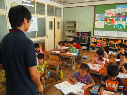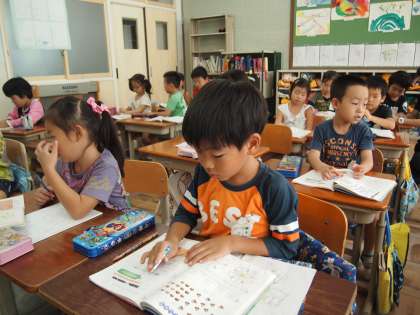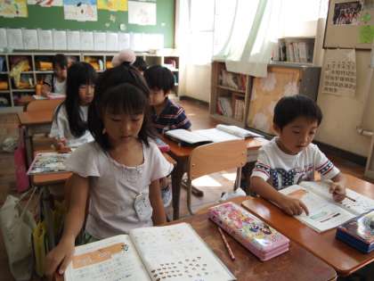 1年2組は教科書の「ふくしゅう」の答え合わせをやっています。今まで習ったことばかりなので結構できていたようです。