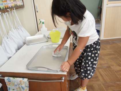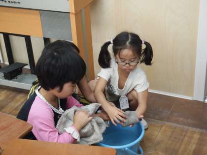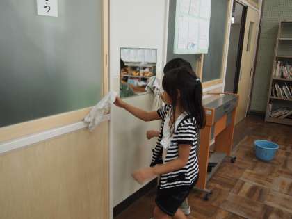 1年生も一生懸命に雑巾を絞っています。またいろんなところを拭いていますね。