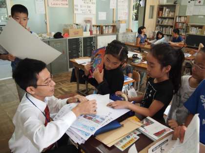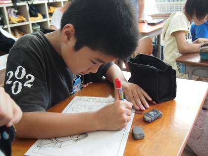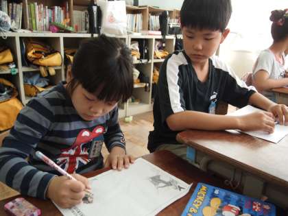 4年2組です。お話の絵の構図を下書きの用紙を使って考えていました。どんな感じになるのでしょうか…。