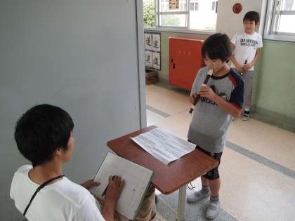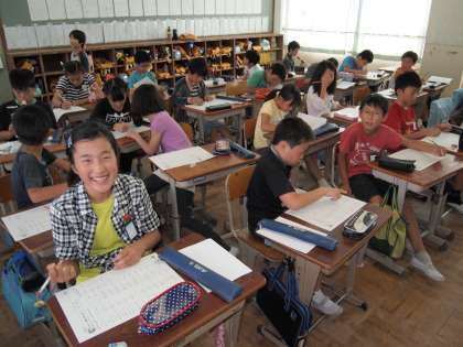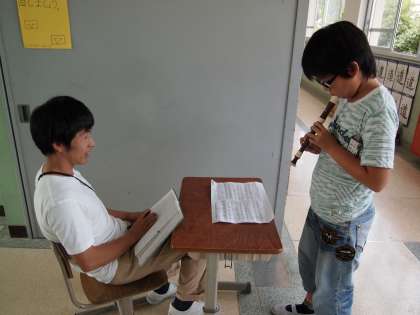 5年2組です。リコーダのテストをやっていました。この前からずっと練習してきた『ルパン3世』です。緊張しながら吹いている子もいれば「笑ってしまった」という子もいました。ほかの子どもたちは教室で課題に取り組んでいます。