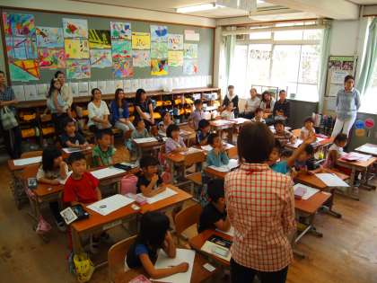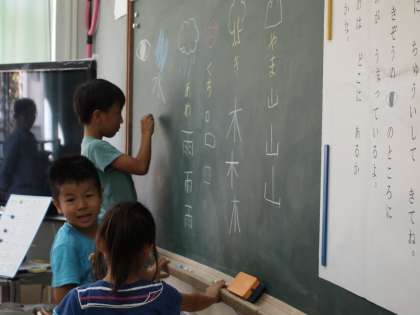 1年1組です。こちらも「かんじのはなし」で黒板に漢字のでき方(絵)を書いてくれていました。