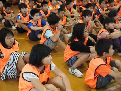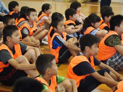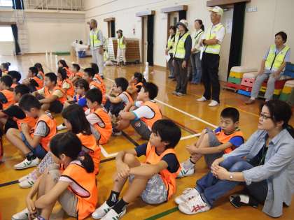 自転車安全利用推進委員の方や西京警察署の方のお話を真剣に聞く子どもたち…。