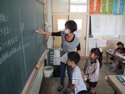 3年1組です。算数の「あまりを考えて」でケーキを箱に入れる問題にトライしていました。