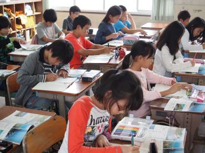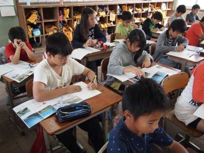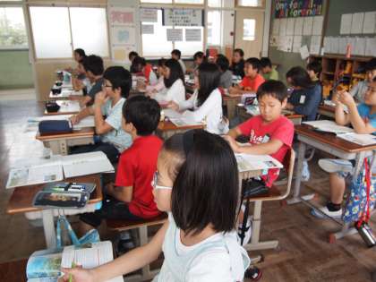 5年2組の社会の時間です。「環境と食料生産」の学習で黒板には田んぼの絵とそこに住む生き物「タニシ」「カエル」「ヤゴ」「タニシ」…が書かれていました。