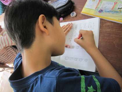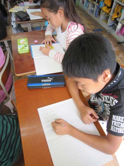 4年2組では,練習してきた漢字を先生の声に合わせてノートに書いていました。