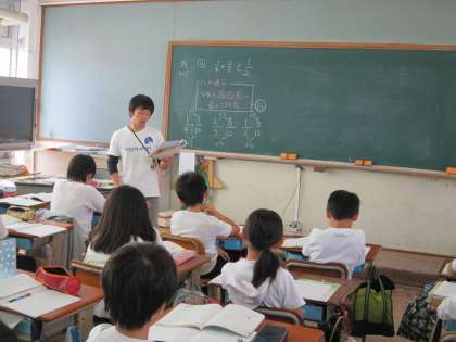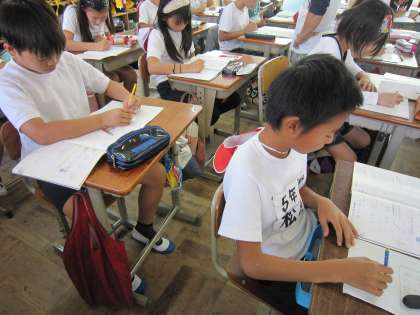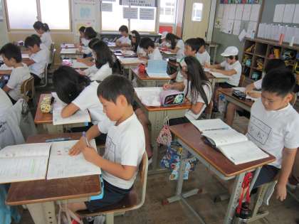 5年2組では,算数で3つの分数の大小を比べるために,通分をしていました。
