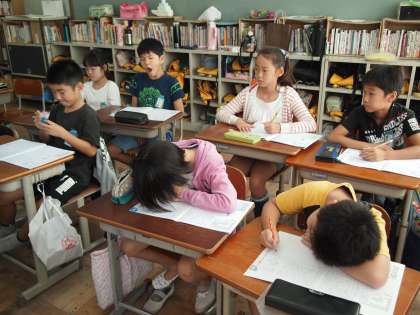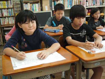 4年2組です。書かれたお手本の作文を10分間で正しく書き写すという課題が出ています。その中で正しい言葉の使い方や文章の書き方などを学ぶのでしょう。