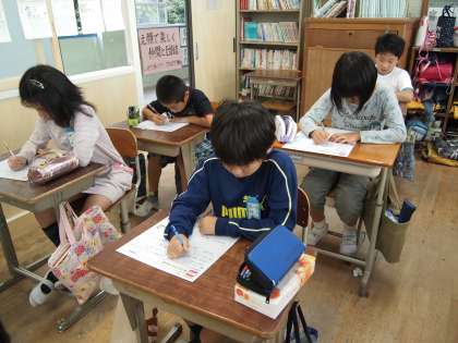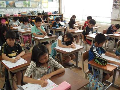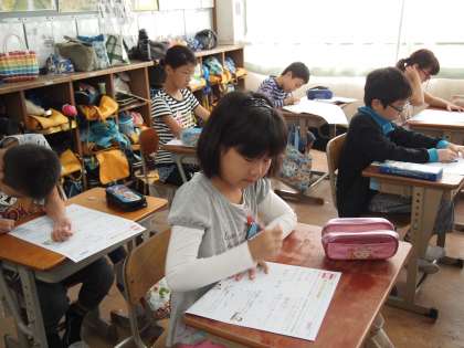 4年1組は算数のテスト「ふたけたでわる わりざんのひっ算」が始まります。それまで聞こえていた話し声が「ぴたっ」とやみました。