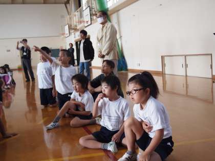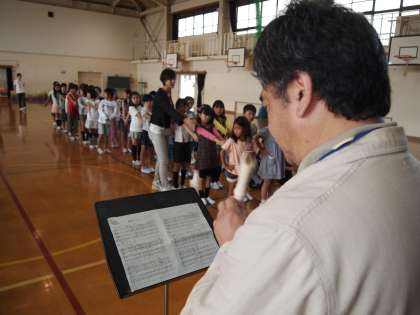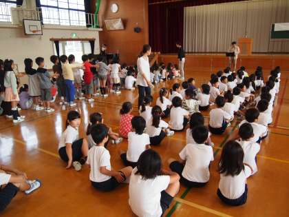 体育館に子どもたちが入ってきます。今日は教務主任の先生が『ジュピター』をリコーだで演奏してくれています。この前はギターでしたが毎回いろいろと楽しませてもらっています。あおぞら学級の子どもたちも興味津々で覗き込んでいますよ。