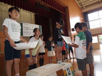 跳び箱の表彰台に上がるのは3位の2年1組,準優勝の4年1組,そして優勝チームの6年1組の代表児童です。運動委員の『勇者は帰りぬ』のリコーダ演奏をバックに表彰状を受け取っていました。おめでとう!