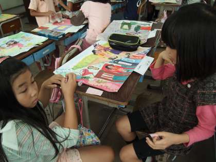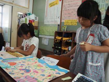 3年1組です。友だちの作品を見て「よいなと思ったところ」や「がんばっているところ」を付箋に書いているところです。