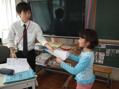 3年2組はテストを返していました。先生が「テストを返してもらう時に両手で受け取る人がいて,それがとっても気持ちがよいですね。中には『ありがとうございます』と言いながらもらう人もいます。みんながそうできるクラスをめざしましょう。」と話していました。その通りだと思います。