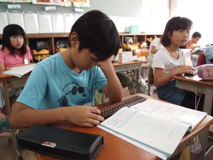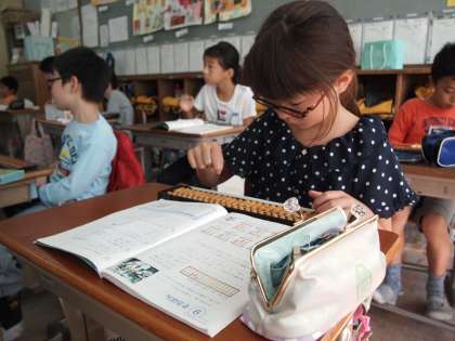 4年1組です。今日のそろばんの学習です。「億」や「兆」というすごく大きな単位が使われています。すごいですね。