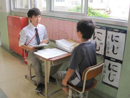 3年生も廊下で先生と二人で話し合いながら通知票をもらっていました。