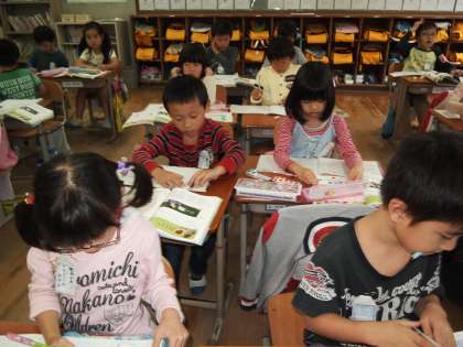 1年1組です。「たしざんをしよう」といっぱい問題が書かれていました。頑張って取り組みました。