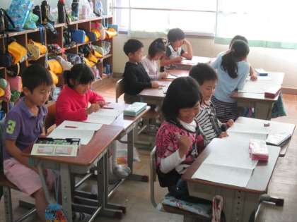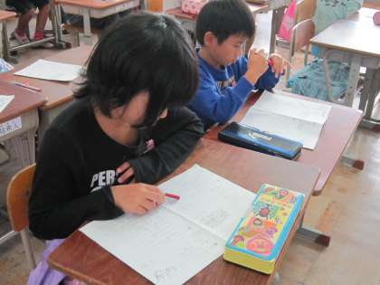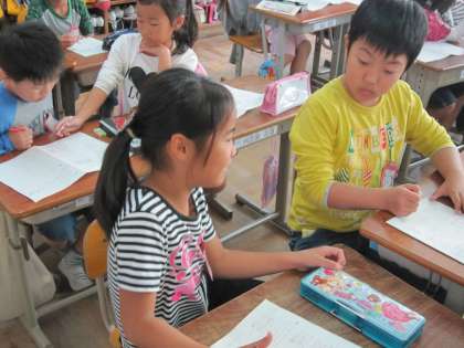 2年1組では,算数のプリントが宿題に出されていました。みんなでその宿題プリントの答え合わせをしていました。
