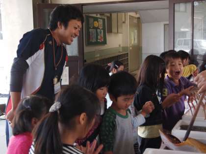 おじさんがひっかけているのはエイです。先生も楽しそうですね。