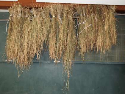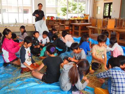 後ろの黒板には稲わらが干してあります。田んぼで見られる光景がこんなところで見られました。