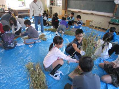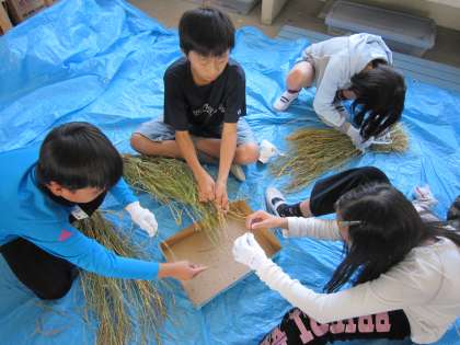 乾燥した稲を,手で脱穀しました。