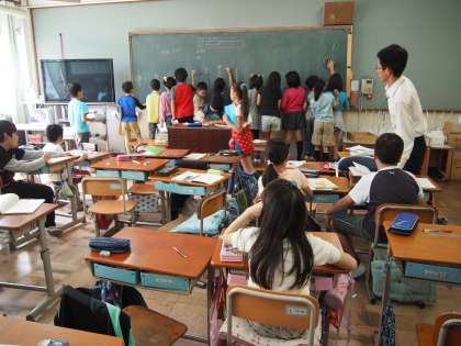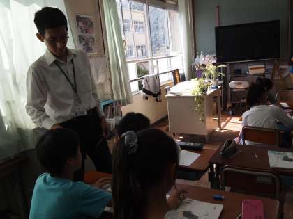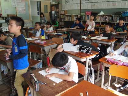 4年2組です。総合的な学習の時間で「人にやさしいまち」について考えています。今月が盲導犬協会の方に来ていただいてお話を聞く機会を持つ予定です。