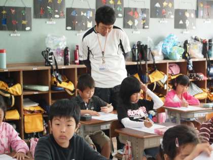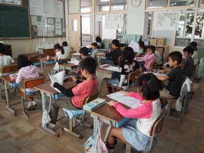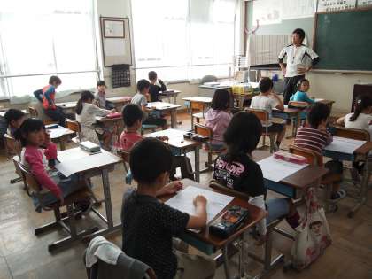 2年1組です。算数の「ふえたりへったり」(たし算とひき算がまざった式)のテストが始まるところです。しっかりできたかな?