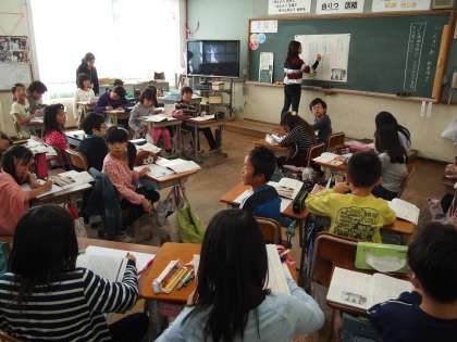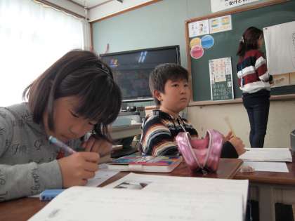 4年1組の『ごんぎつね』です。第6場面,兵十が火縄銃でごんを打つところです。「今日こそごんを撃ってやろう」と意を決した兵十…。