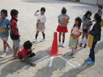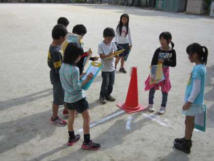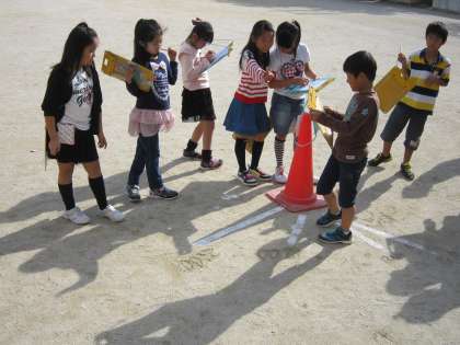 子ども達は,運動場に置いたコーンのかげを見ながら,太陽の動きを観察していました。